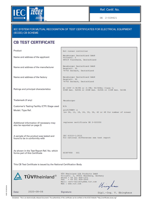 The profiTEMP hot runner controller, which was designed for integration into injection moulding machines, was tested by TÜV Rheinland. Regarding the standards for safety requirements for the North American market, the profiTEMP system achieved positive test results and therefore received the cTUVus certification (CU 72142541.01).